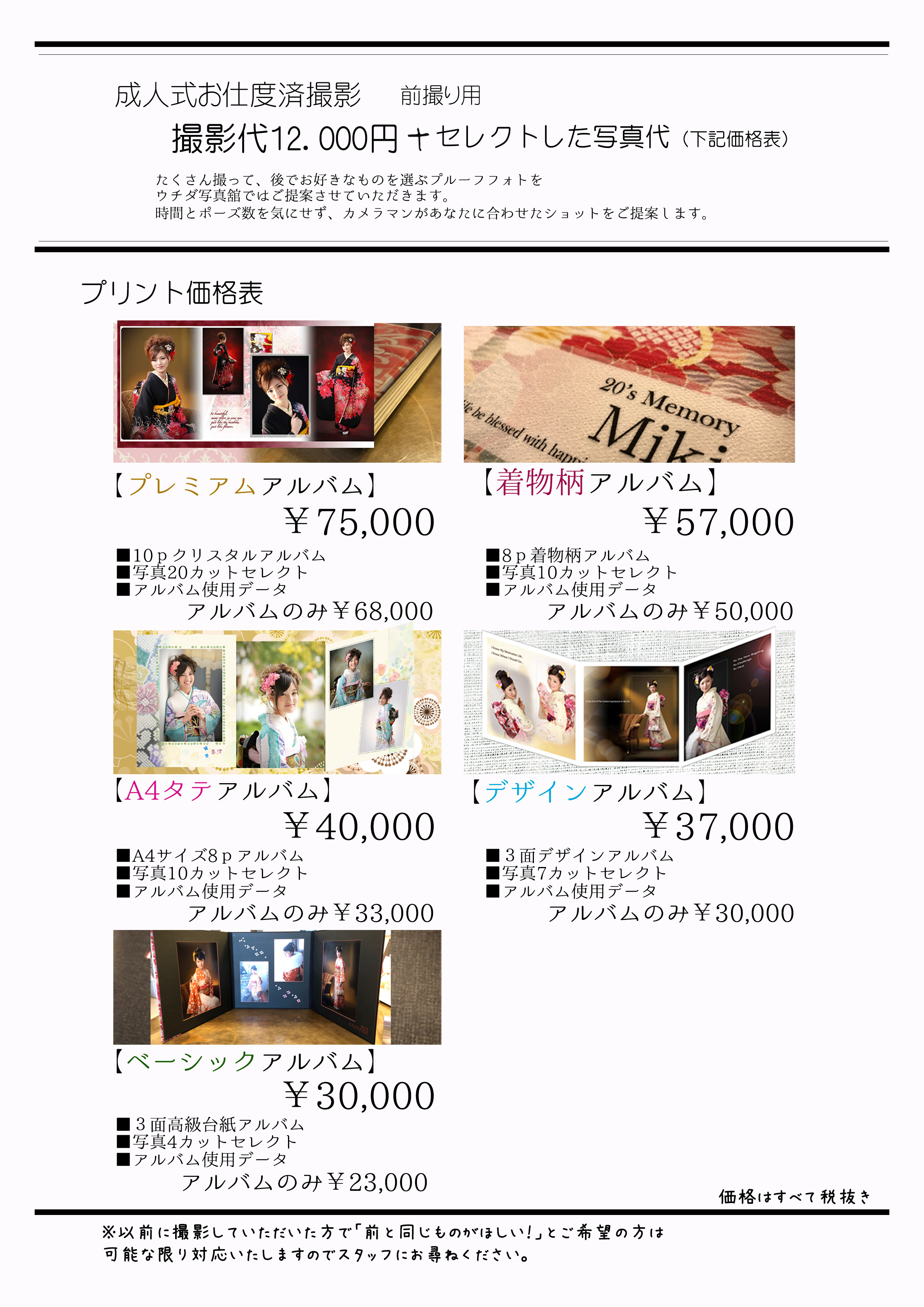 ご成人記念撮影 撮影代13,200円+各種写真プラン★詳しい料金について こちら【料金表】から※料金はすべて税込表記です。